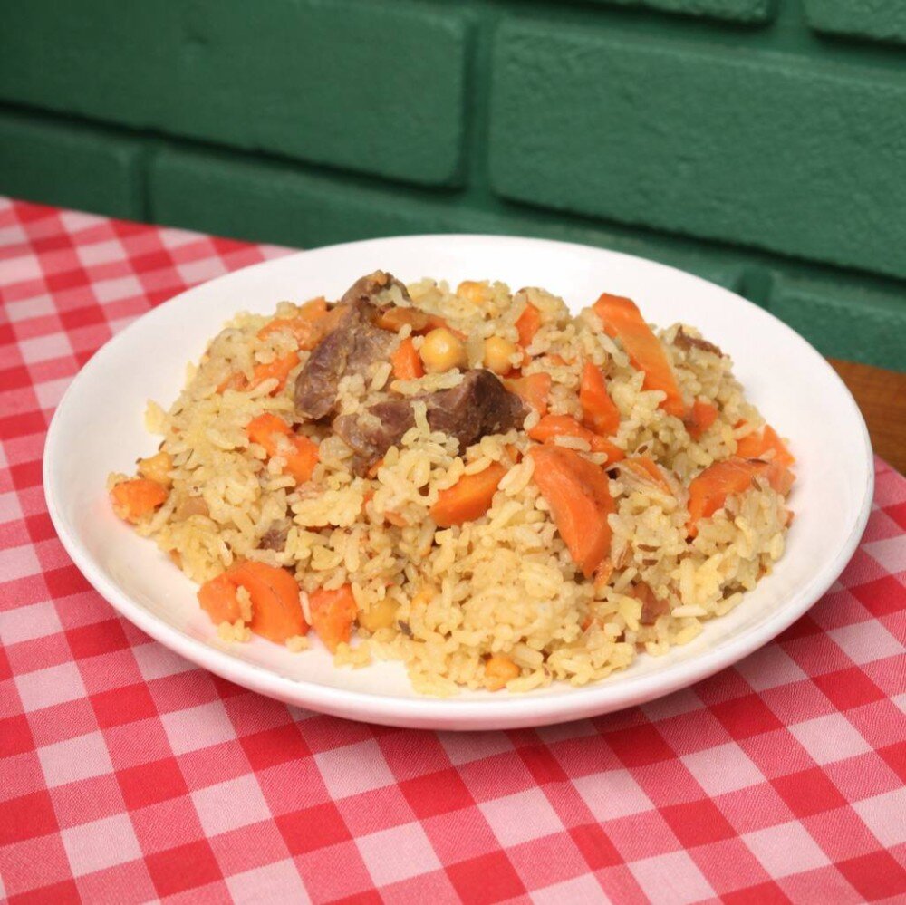 Масло растительное, зира, лук репчатый, чеснок, мясо говяжье, рис, морковь, нут, изюм, барбарис, куркума, перец, вода, соль