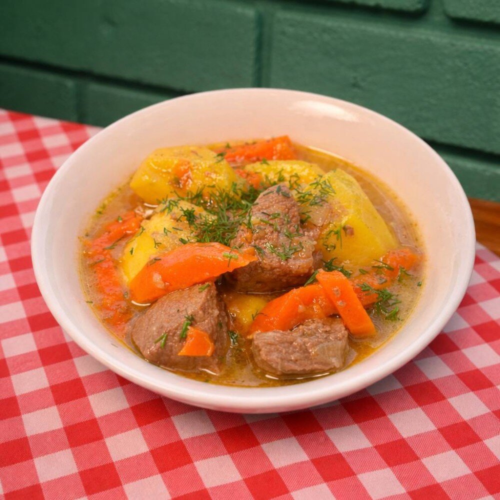 Мякоть говяжья, лук репчатый, морковь, картофель, масло растительное,соль, перец, лавровый лист, чеснок