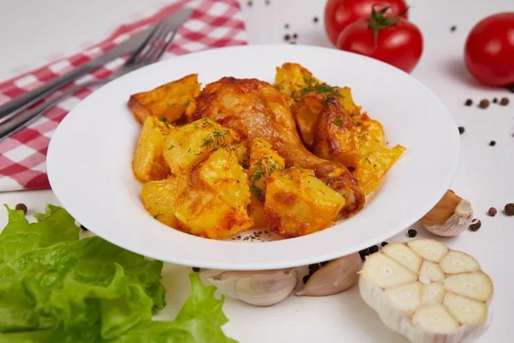 Куриная голень, запечённая с картофелем — сытное и ароматное блюдо с румяной корочкой. Халяль.